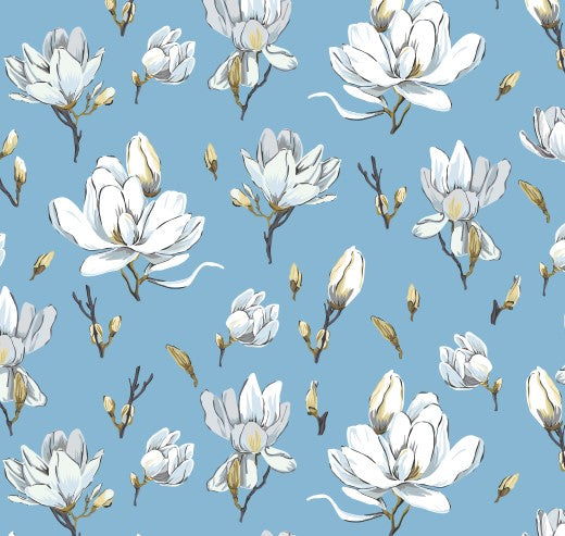 White magnolias bloom on a serene blue background, radiating timeless elegance and soft femininity. This print captures the essence of a royal era with a modern grace — a perfect touch of quiet luxury and effortless sophistication."