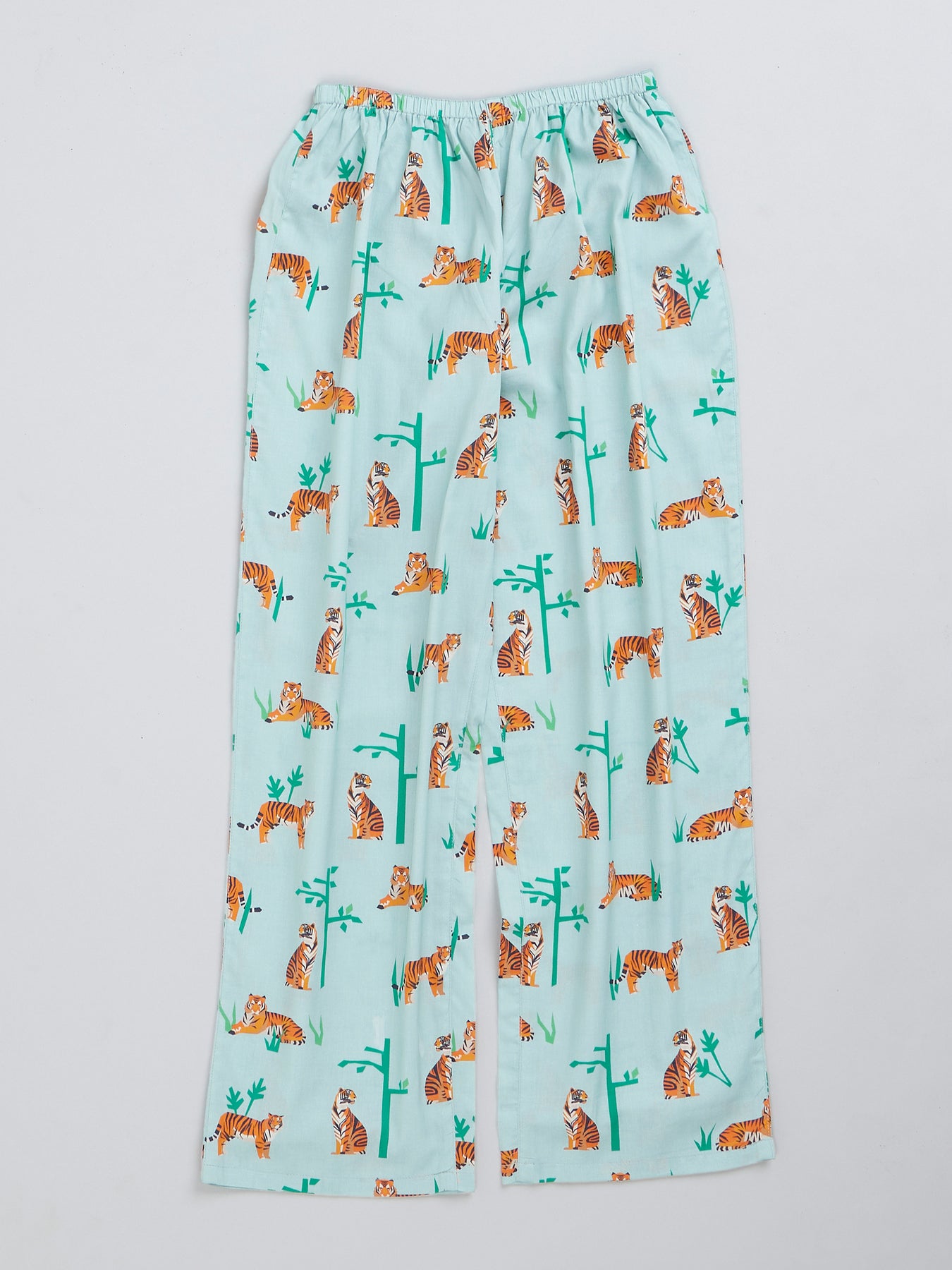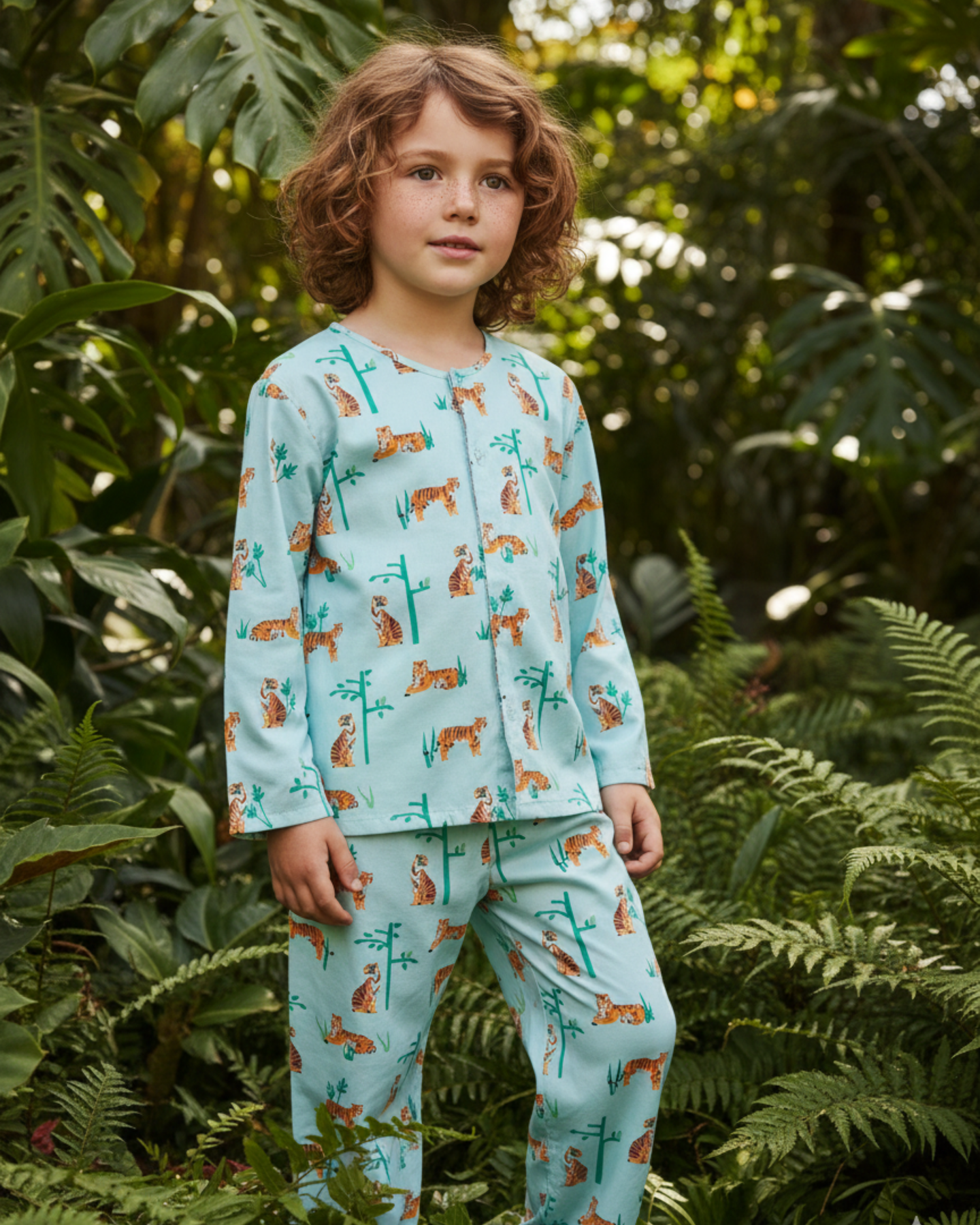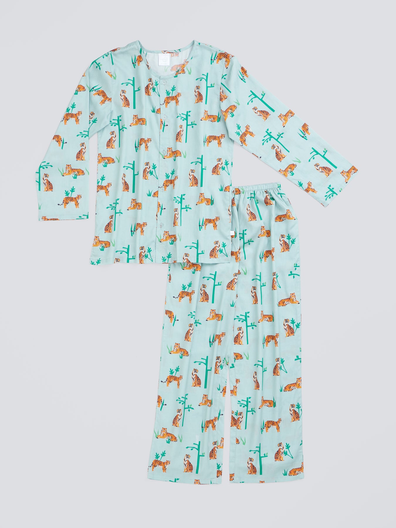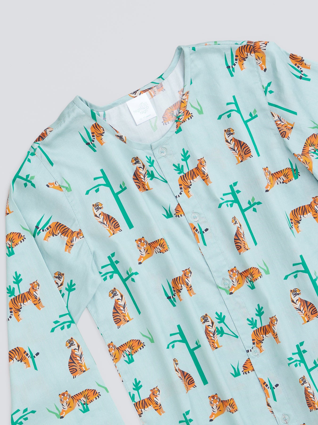 Unleash your wild side in our tiger print nightwear with a sense of quiet confidence. This design blends bold stripes with calm tones — perfect for those who dream with courage and wake with power. "