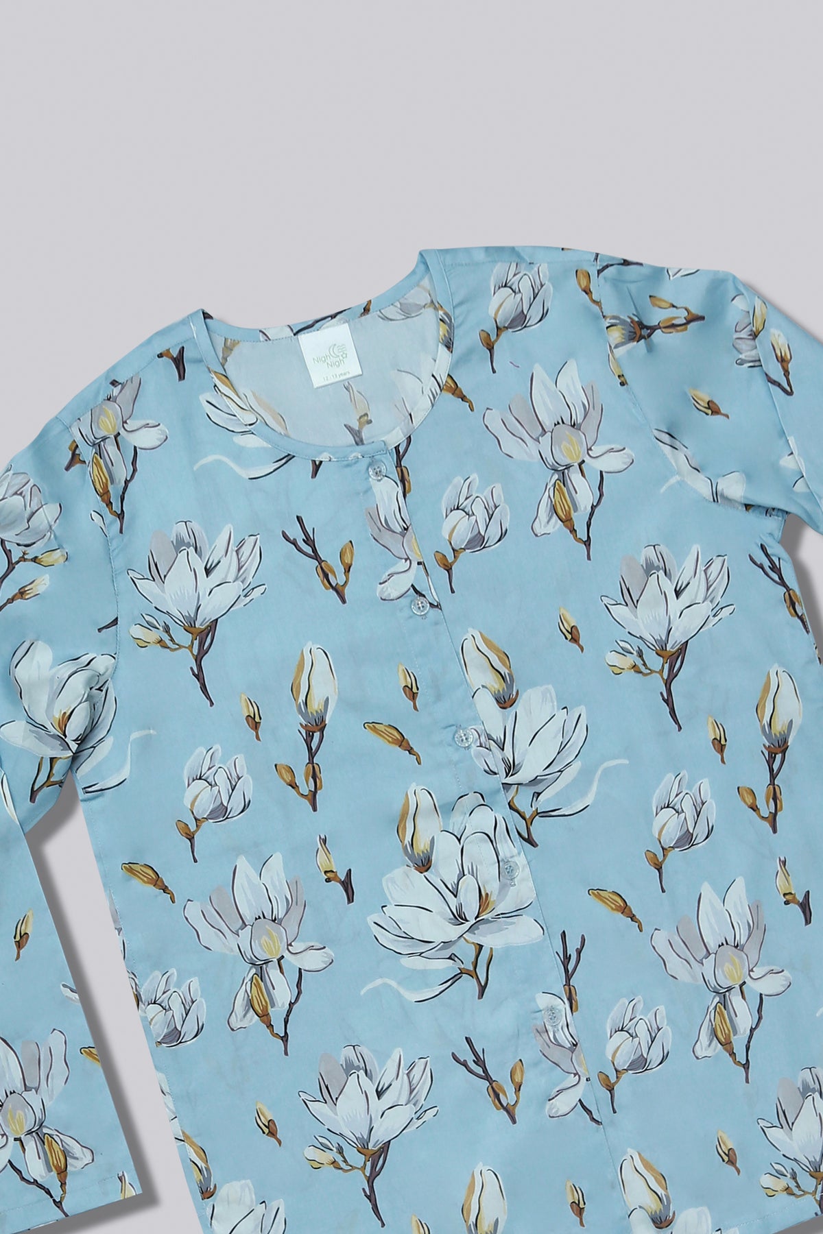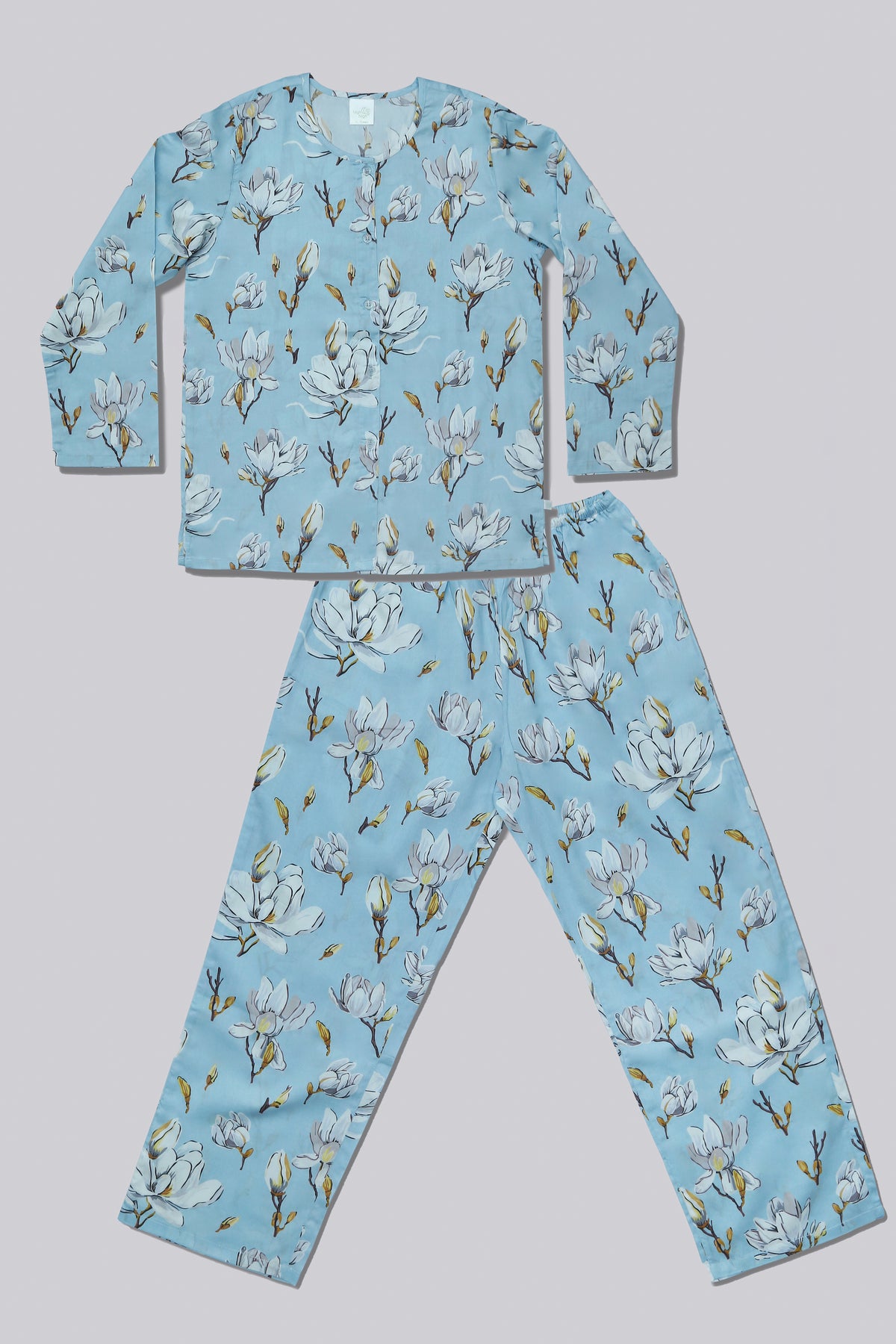 White magnolias bloom on a serene blue background, radiating timeless elegance and soft femininity. This print captures the essence of a royal era with a modern grace — a perfect touch of quiet luxury and effortless sophistication."
