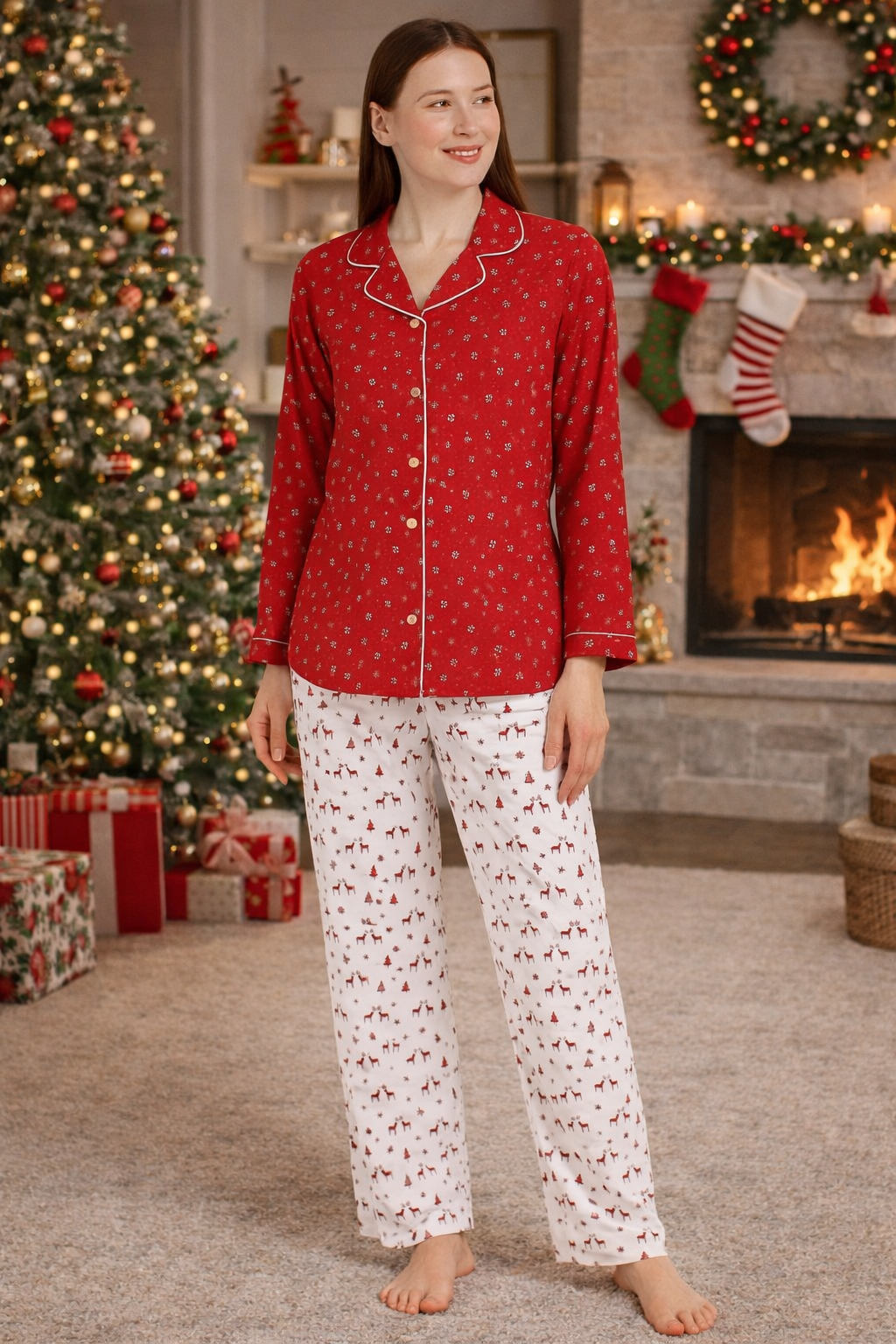Step into the warmth and festive cheer with our Red Reindeer nightwear. The top, sprinkled with playful reindeers, snowy trees, and delicate snowflakes, captures the joyful spirit of the festive Christmas morning. Paired with a deep red bottom adorned with twinkling white snowflakes, it brings the charm of a winter wonderland right to your bedtime."